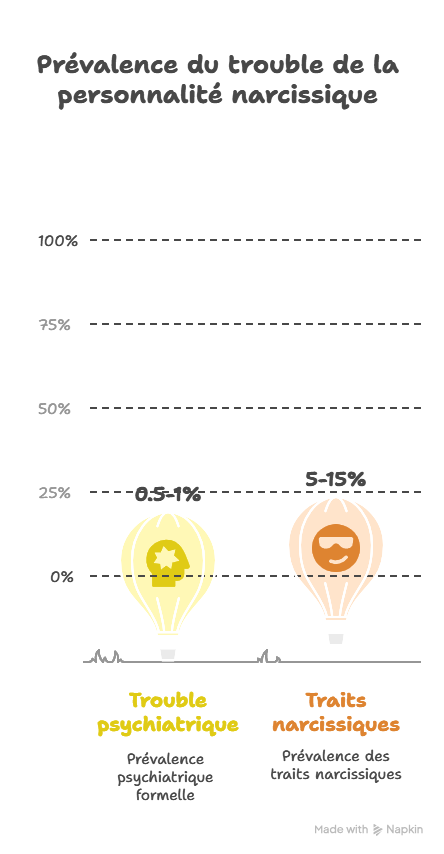 Les études internationales estiment que le trouble de la personnalité narcissique, au sens psychiatrique, concerne environ 0,5 à 1 % de la population. Si l’on élargit aux traits narcissiques plus ou moins marqués, certains chercheurs avancent des chiffres bien plus élevés, allant de 5 à 15 %.