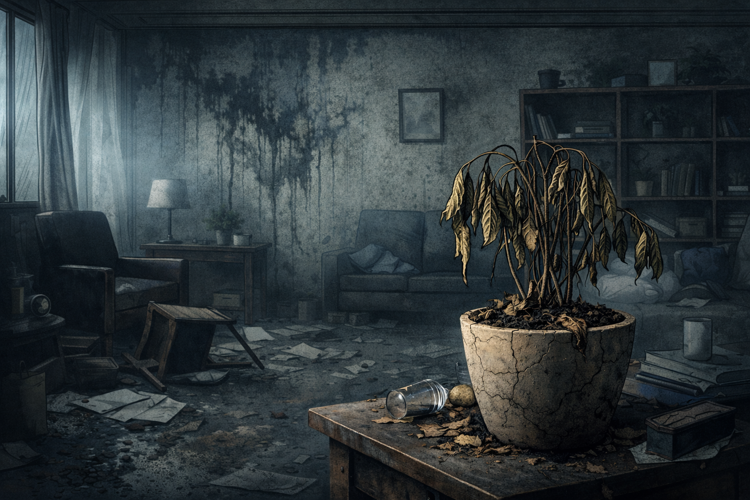 Certaines plantes du cabinet, autrefois vigoureuses, ont visiblement souffert, comme si elles avaient absorbé une part du mal ambiant.